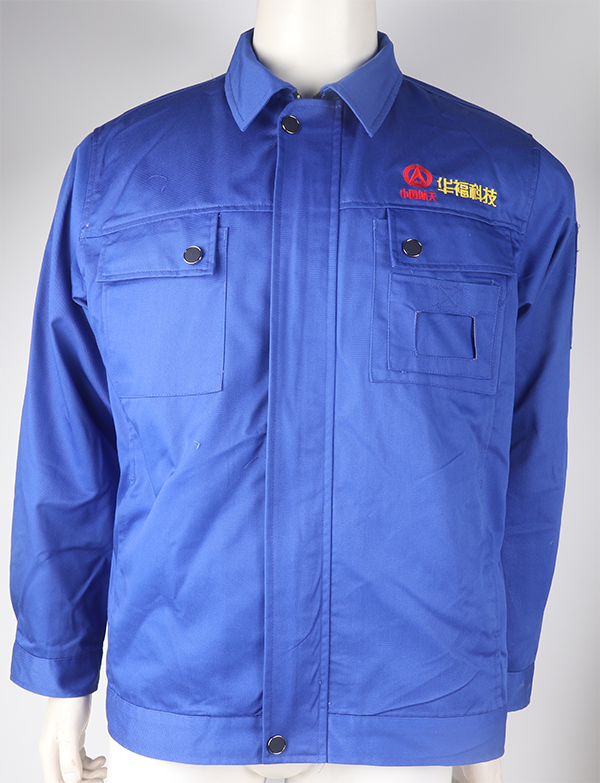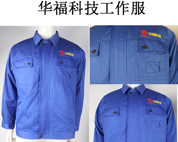 華福科技工作人員主要也是車間流水工作大部分是男性員工,在設計顏色采用了深藍色,還是傳統的工裝款式,布料采用滌棉紗卡,這種面料勻整光潔,質樸柔和,吸濕耐磨,尤其經過熨燙后,柔軟舒適,沒有折痕,是作為工裝的首選面料。